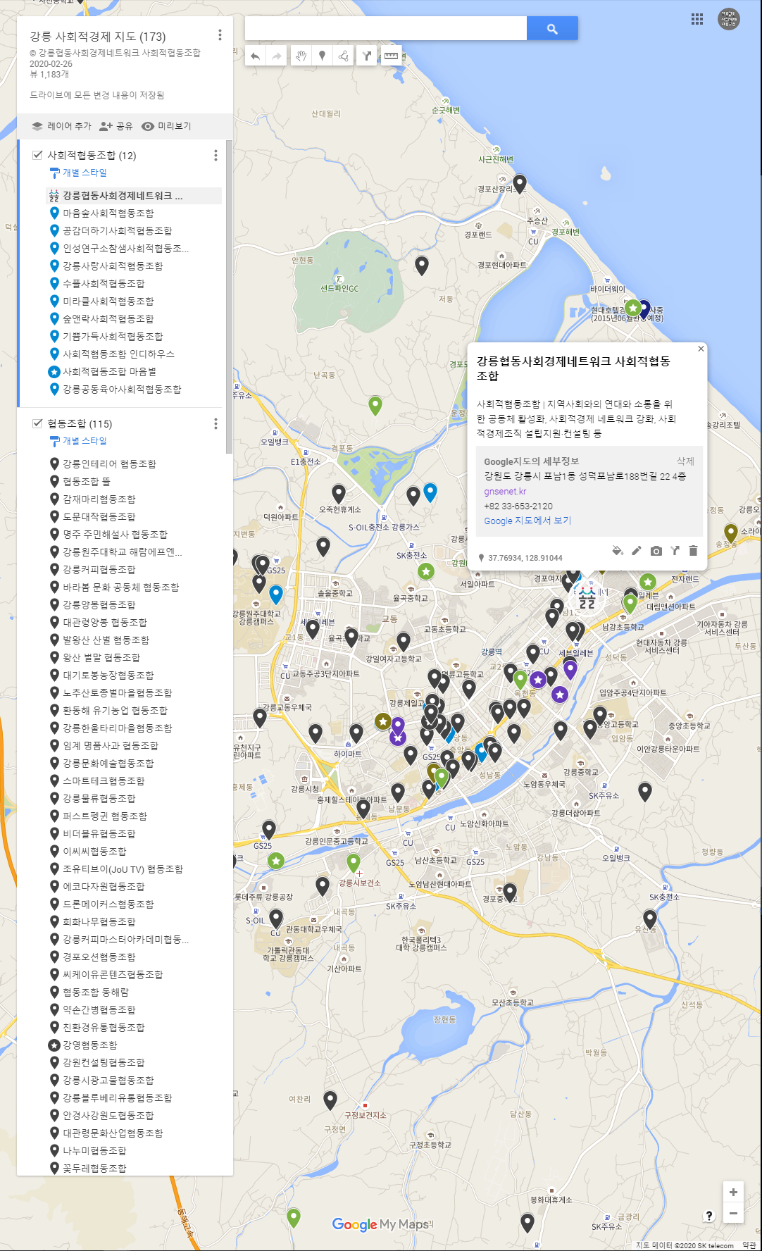 강릉시에 위치한 사회적경제기업(사회적기업, 협동조합, 자활기업, 마을기업)을 한눈에 볼 수 있도록 지도를 만들어 봤습니다.