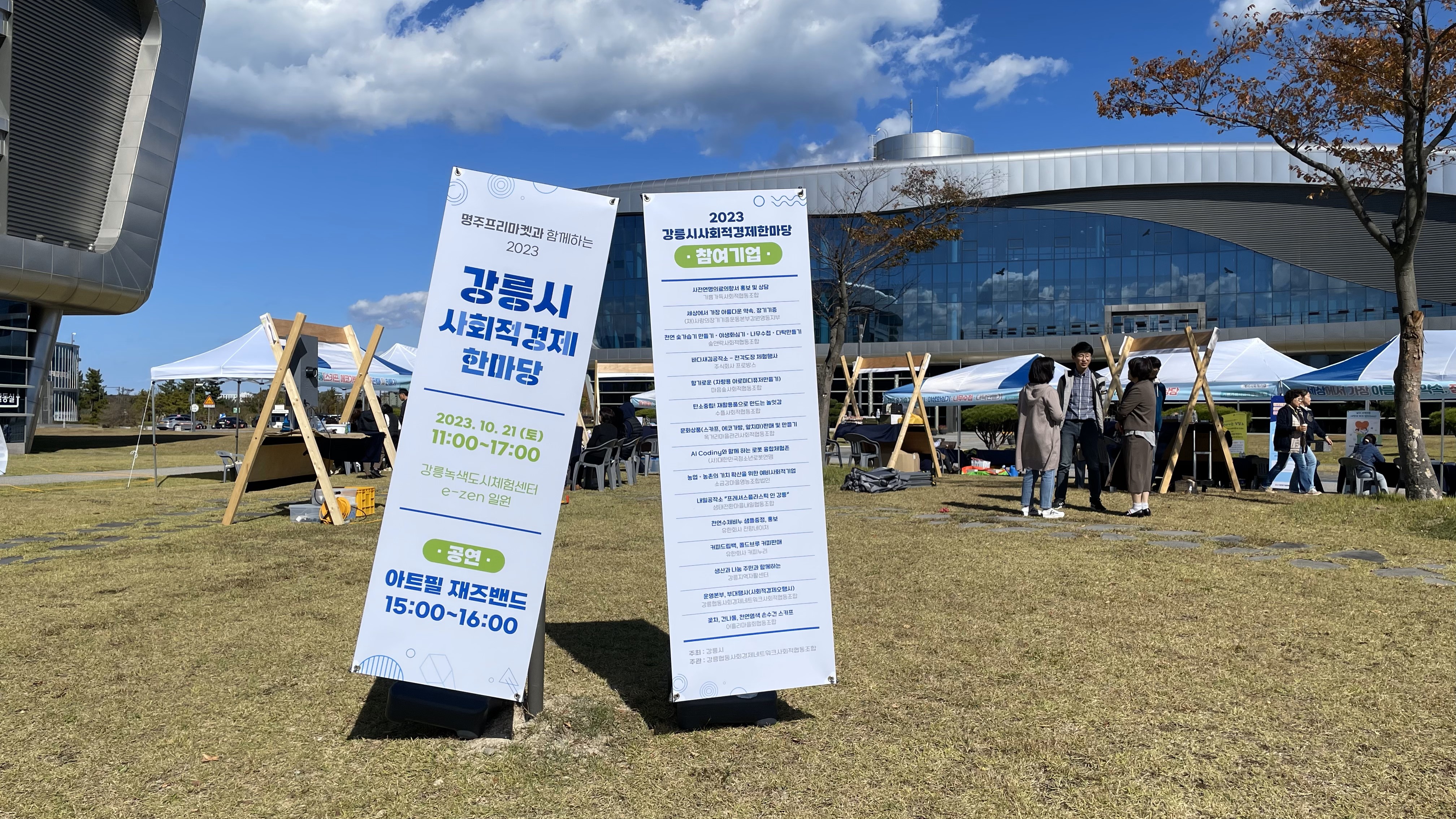 강릉녹색도시체험센터 이젠(e-zen) 에서 2023 강릉시사회적경제한마당이 진행됩니다.강릉녹색도시체험센터 이젠(e-zen) 에서 2023 강릉시사회적경제한마당이 진행됩니다.아트필 재즈밴드 공연이 준비되어 있습니다.강릉시사회적경제한마당 행사안내 배너강릉지역자활센터와 행복농장은 한과, 유정란 판매 접수를 진행하였습니다.강릉협동사회경제네트워크 사회적협동조합은 운영본부, 사회적경제 5행시를 진행하였습니다.기쁨가득사회적협동조합은 사전연명의료의향서 홍보 및 상담, 접수를 진행하였습니다.(사)대한민국청소년로봇연맹에서 로봇 융합체험을 진행하였습니다.마음숲사회적협동조합에서 차량용 아로마디퓨저만들기 행사를 진행하였습니다.명주프리마켓과 함께 진행하였습니다.생태전환마을내일협동조합에서 분쇄된 플라스틱을 이용한 단추만들기, 카라비너 만들기를 진행하였습니다.소금강마을영농조합법인에서 복숭아병조림, 복숭아잼 판매수플사회적협동조합의 재활용품으로 만드는 놀잇감 체험행사숲앤락사회적협동조합의 야생화심기, 나무수첩만들기 체험과 천연숯가습기, 커피박화분 판매주식회사 아트필의 아트필재즈밴드 공연예비마을기업인 어흘리마을회협동조합의 꽃차, 천연염색 손수건, 스카프 판매사회적경제 5행시옥거리마을관리사회적협동조합의 에코가방 만들기 및 스카프, 앞치마 판매강릉 유일의 커피전문 사회적기업인 유한회사 커피누리의 대박세일행사(재)사랑의장기기증운동본부 강원영동지부에서 참여해주셨습니다.주식회사 프로방스의 전각도장 체험행사! 가장 인기가 좋았습니다.유한회사 천향에서 천연비누 무료증정 이벤트를 진행하였습니다.