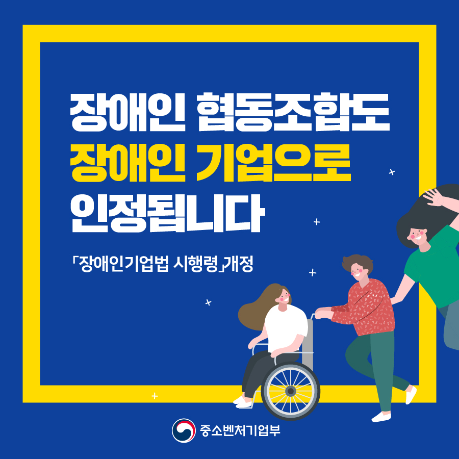 「장애인기업법 시행령」개정중소벤처기업부는 장애인 기업 인정 범위 확대(협동조합 포함), 장애인 기업 ...